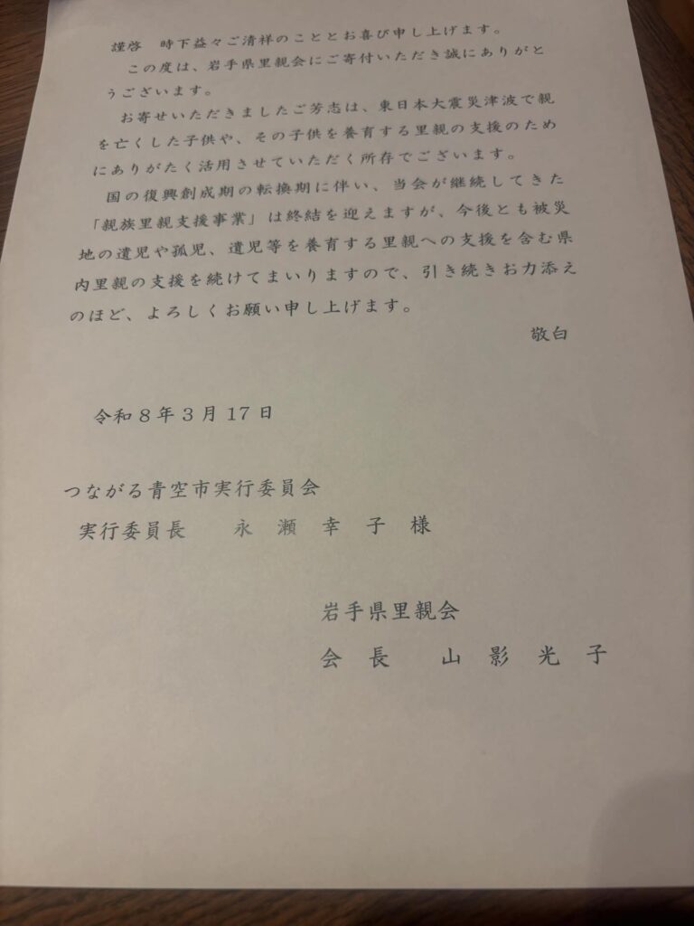 里親会様よりお礼のお手紙が届きました^ ^